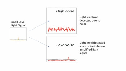 激光雷達系統通常使用跨阻抗放大器(TIA)將APD產生的電流脈沖轉換為電壓脈沖。時間數字轉換器可以更輕松地處理這些信號,并提供算法所需的信息。APD的增益越高,每個脈沖的輸出電平就越強,但背景噪聲也會越大。這種噪聲是雪崩過程的統計性質造成的,因為每個入射光子引發的碰撞次數可能會有很大差異。設計增益過高的二極管會導致TIA輸出產生過多的背景噪聲,從而掩蓋來自遠處低反射率物體的產生的微小脈沖。