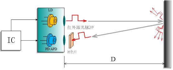 激光器向目標發射脈沖激光,經目標反射后,由探測器接收。通過計時器獲得發射脈沖與接收脈沖之間的往返時間差Δt以及光速c,計算出目標的距離D。