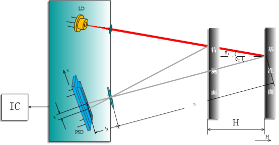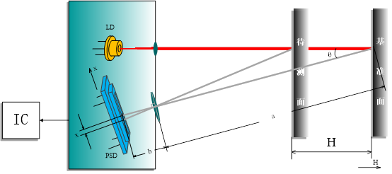 激光三角法是根據PSD上像點的位移來測算目標障礙物距離的方法。三角法有直射式和斜射式兩種結構,假設測量像點在光敏面上的位移為x,待測面沿軸方向的位移為H,分別可得到兩種方法下x與H的關系式。