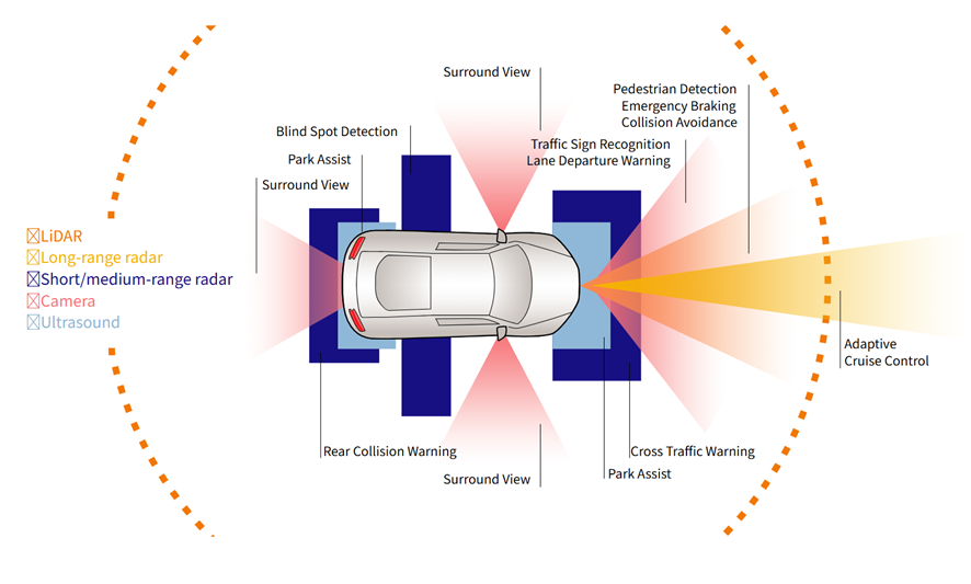 ADAS采用的傳感器主要有攝像頭、毫米波雷達(dá)、激光和超聲波等。攝像頭用于視覺識別,如車道線檢測、交通標(biāo)志識別等;毫米波用于探測前車距離和速度,適用于雨雪天氣或光線不足等環(huán)境;激光雷達(dá)精度高,能夠構(gòu)建三維環(huán)境地圖;超聲波傳感器主要用于短距離感知,如泊車輔助系統(tǒng)。
