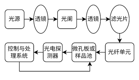 其中,I_t為透過介質(zhì)后的光強,I0為入射光的初始光強,ε為介質(zhì)的摩爾吸光系數(shù),c為吸收物質(zhì)的濃度,l為介質(zhì)的有效光程。生化分析儀一般采用多通道探測器陣列,可對同一成分的溶液或多種成分的混合液進(jìn)行濃度測定。通過對比這些成分的數(shù)據(jù)庫,可以精確計算出每種成分的濃度或含量,包括但不限于蛋白質(zhì)類、酶類、糖類、脂類、電解質(zhì)類和代謝物類指標(biāo),為診斷方案和治療決策提供幫助。