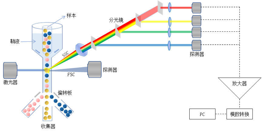 流式細胞儀由三個系統(tǒng)組成:液流、光學(xué)和電子系統(tǒng)。液流系統(tǒng)是對鞘液(通常是緩沖鹽水溶液)加壓以將樣品輸送到激光照射的點位。光學(xué)系統(tǒng)由激發(fā)光學(xué)器件(激光器)、收集光學(xué)器件(光電二極管)、透鏡等組成。電子系統(tǒng)將來自探測器的信號轉(zhuǎn)換為可由計算機讀取的數(shù)字信號。